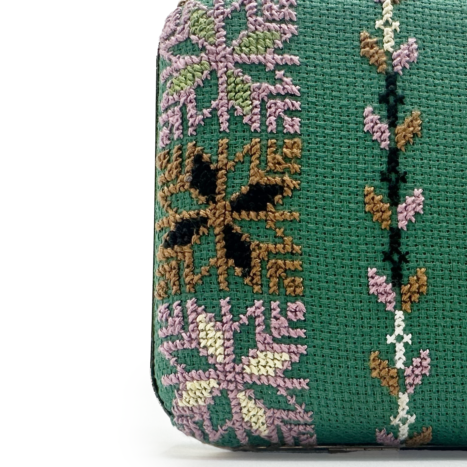 The Green Garden Path Tatreez Clutch embodies stories of nature and hope. Featuring hand-embroidered floral motifs and vine-like designs in pink, gold, and earthy shades, this clutch radiates elegance with a cultural soul. Whether paired with a simple dress or a bold outfit, it brings a unique touch of Palestinian artistry to your look.